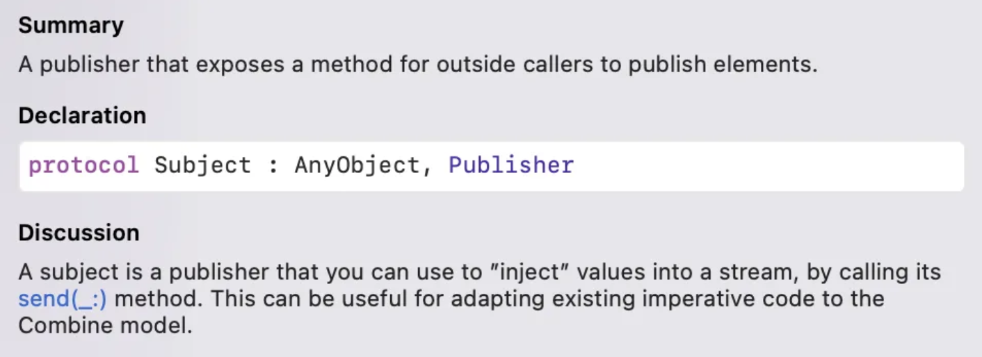 위를 잘보면 Subject도 프로토콜이며 Publisher 프로토콜을 채택하고 있고, Summary에는 “stream에 send(_:) 메서드를 호출해서 값을 주입할 수 있는 Publisher이다.”라고 써져 있다.
