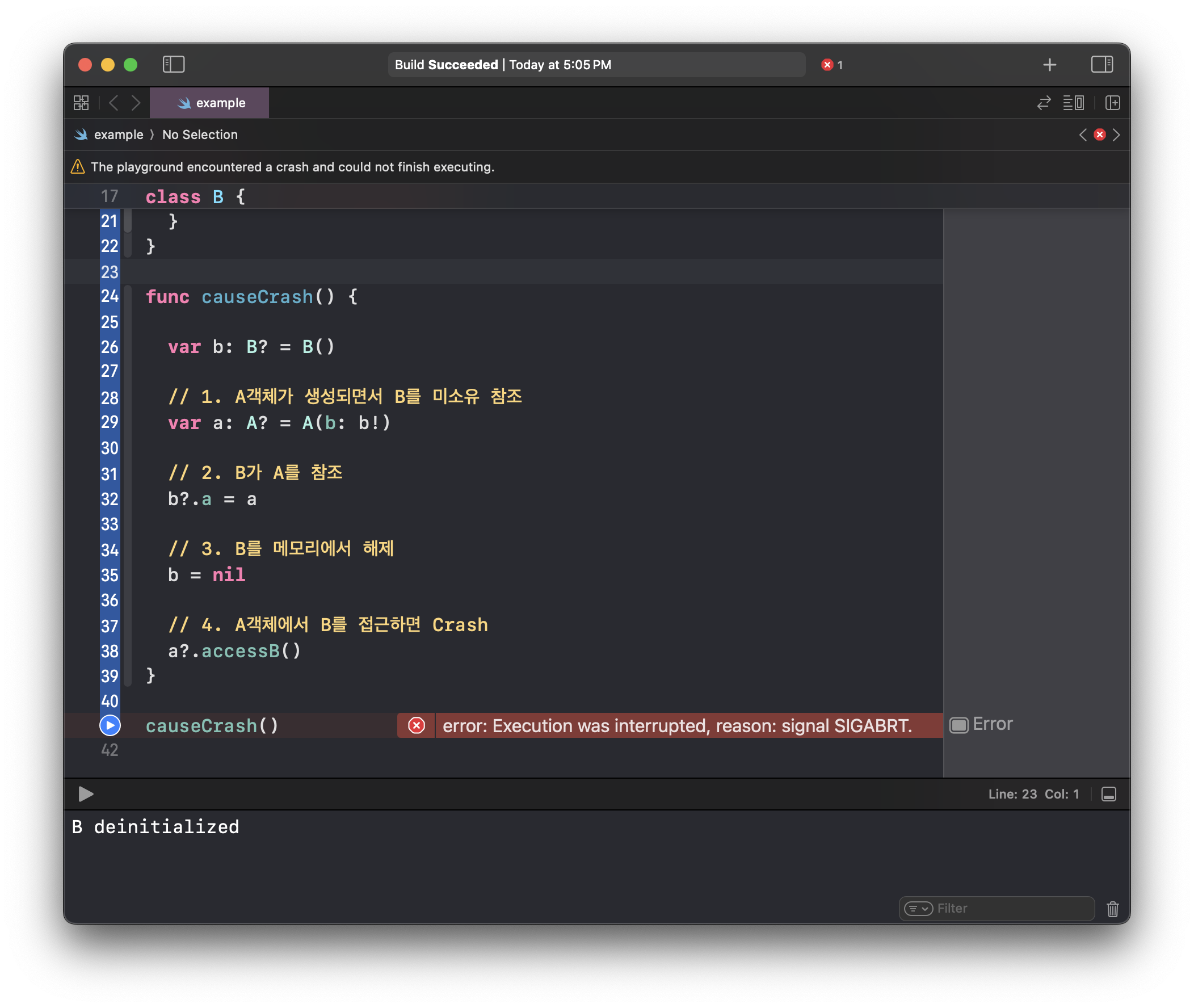 A Class에 B Class를 참조할때 weak 키워드를 붙여본다면, 순환 참조가 생기지 않고 메모리에서 해제되는 것을 볼 수 있다.